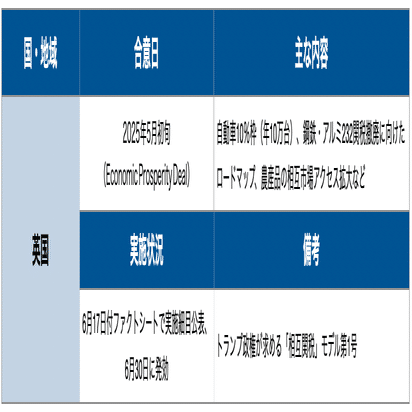 今後、7月9日の「相互(リシプロカル)関税」期限が延長される可能性もホワイトハウス報道官が示唆していますが、現時点で署名国は英国だけという構図に変化はありません。