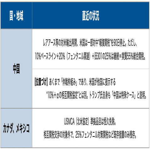 - 限定的な停戦枠組み:中国(レアアース等、55%総合関税を維持したまま)