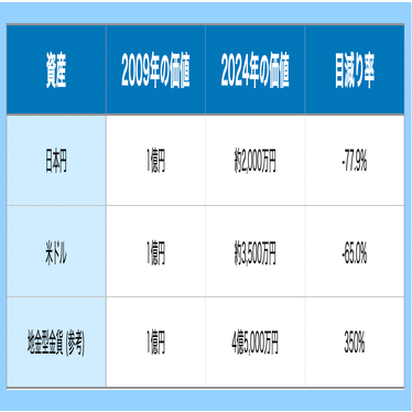 かつては「安全資産」とされていた法定通貨ですが、その信用は大きく揺らいでいます。特に日本円は、過去15年間で77.9%もの価値を失いました。これは、15年前に1億円を預金していた場合、実質的な価値は現在2,000万円程度にまで減少しているということです。