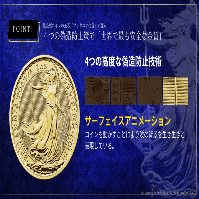 こちらのブリタニア銀貨は、信頼ある英国王立造幣局(ロイヤルミント)が厳格な品質基準に則って製造を手がけており、ブリタニア金貨同様、偽造防止のための高度なセキュリティ技術が施されています。ブリタニア像の盾には細密なラインが刻まれ、角度を変えるとパターンが光を受けて変化するなど、見れば見るほど奥行きを感じられる造りになっています。