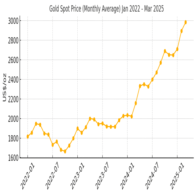 金は古くから「有事の避難先」として重宝され、地政学リスクや金融政策の不確実性が高まる局面で価格が上昇しやすい傾向があります。実際、トランプ氏の再登場や各国の通貨不安が意識され始めたここ最近、金のスポット価格は中長期的に上昇トレンドを描いています。下のグラフは2022年から2025年3月までの金価格(月間平均)の推移を示したものです。2022年は一時的な調整があったものの、2023年以降は世界的なインフレや戦争・政情不安も背景にじりじりと価格を切り上げ、2024年には過去最高値を更新する展開となりました。