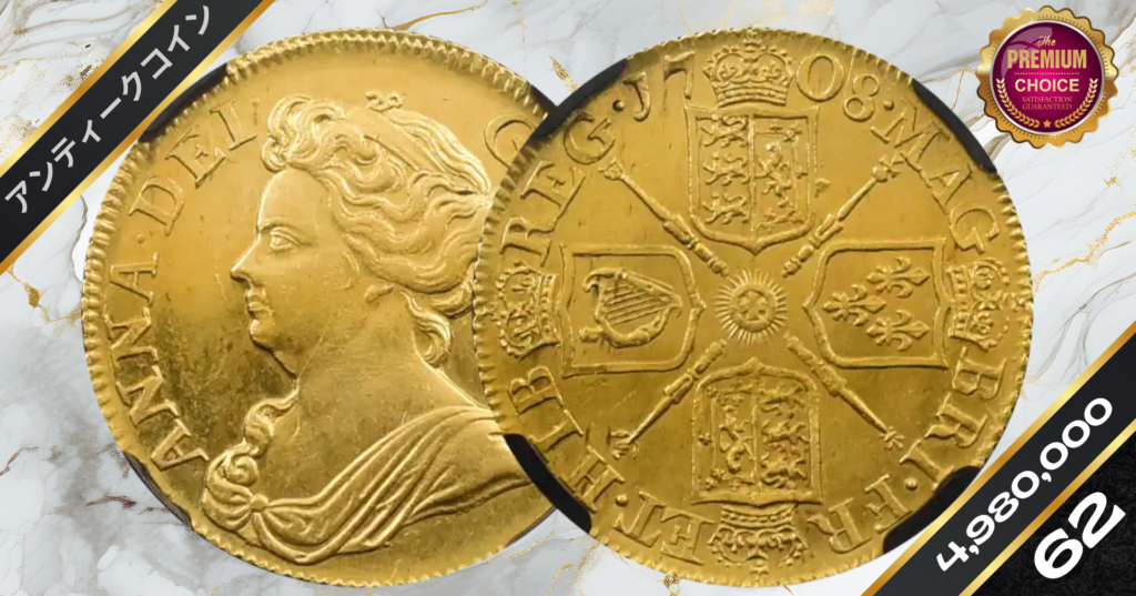今回ご紹介するのは、その激動の時代を色濃く映した一枚――「1708年アン女王ギニー金貨 NGC MS62(S-3572)」です。