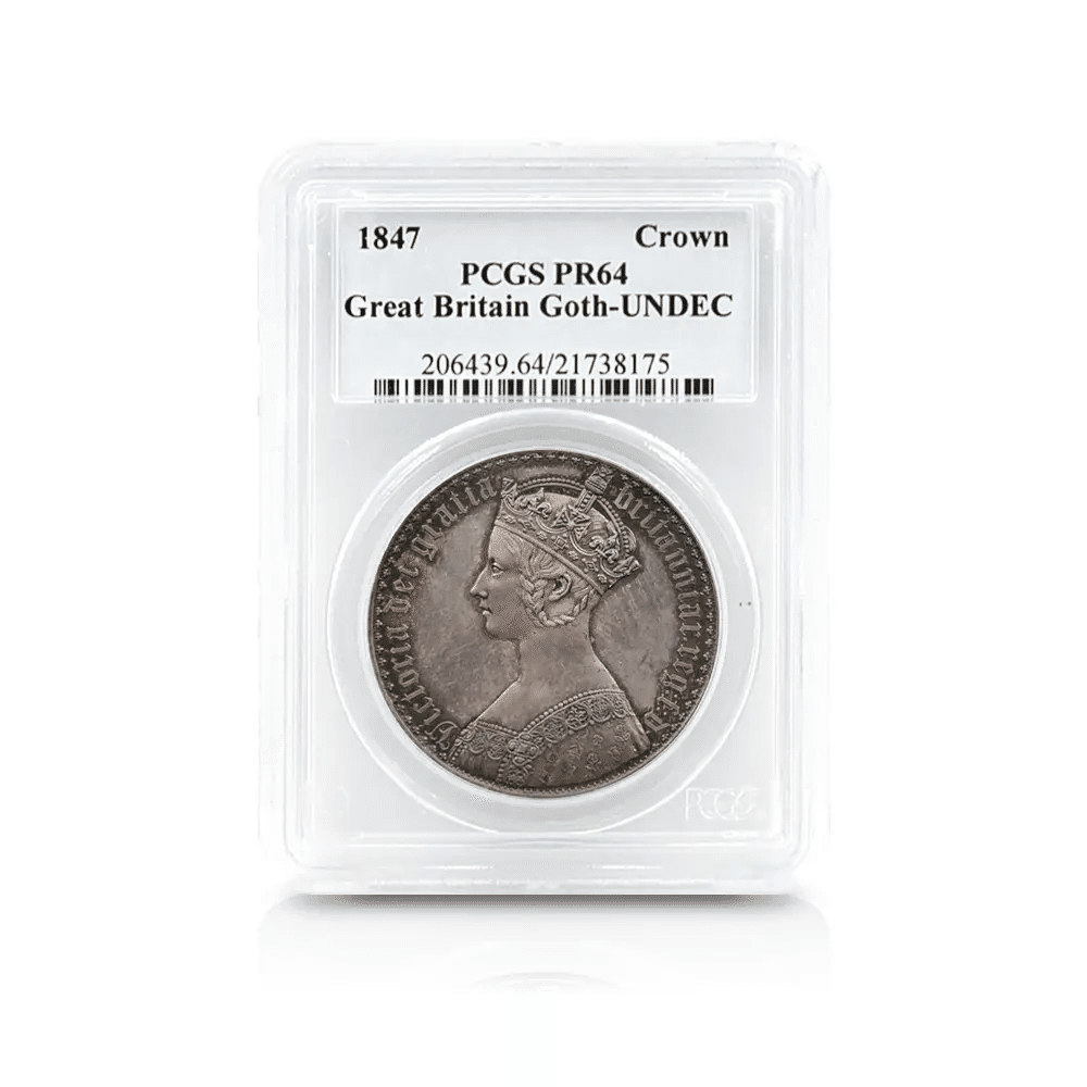 今回ご紹介するのは、その美しさと希少性で世界中のコレクターを魅了する特別な銀貨、『1847年 ヴィクトリア女王 ゴチッククラウン銀貨 アンデシモエッジ PCGS PR64 Esc-2571』です。