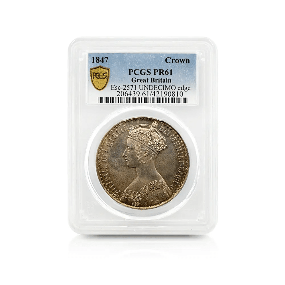今回ご紹介するのは、その美しさと希少性で世界中のコレクターを魅了する特別な銀貨、『1847 ヴィクトリア女王 ゴチッククラウン銀貨 アンデシモエッジ PCGS PR61 Esc-2571』です。