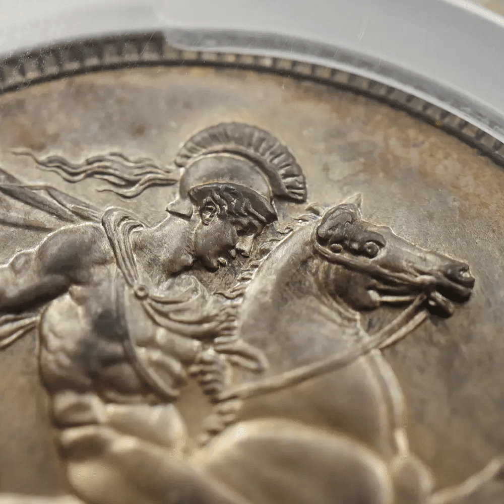 クラウン銀貨という大きなキャンバスに描かれることで、その迫力と美しさはいっそう際立ちます。古典的でありながら、見るたびに新鮮な感動を与えてくれる芸術作品といえるでしょう。