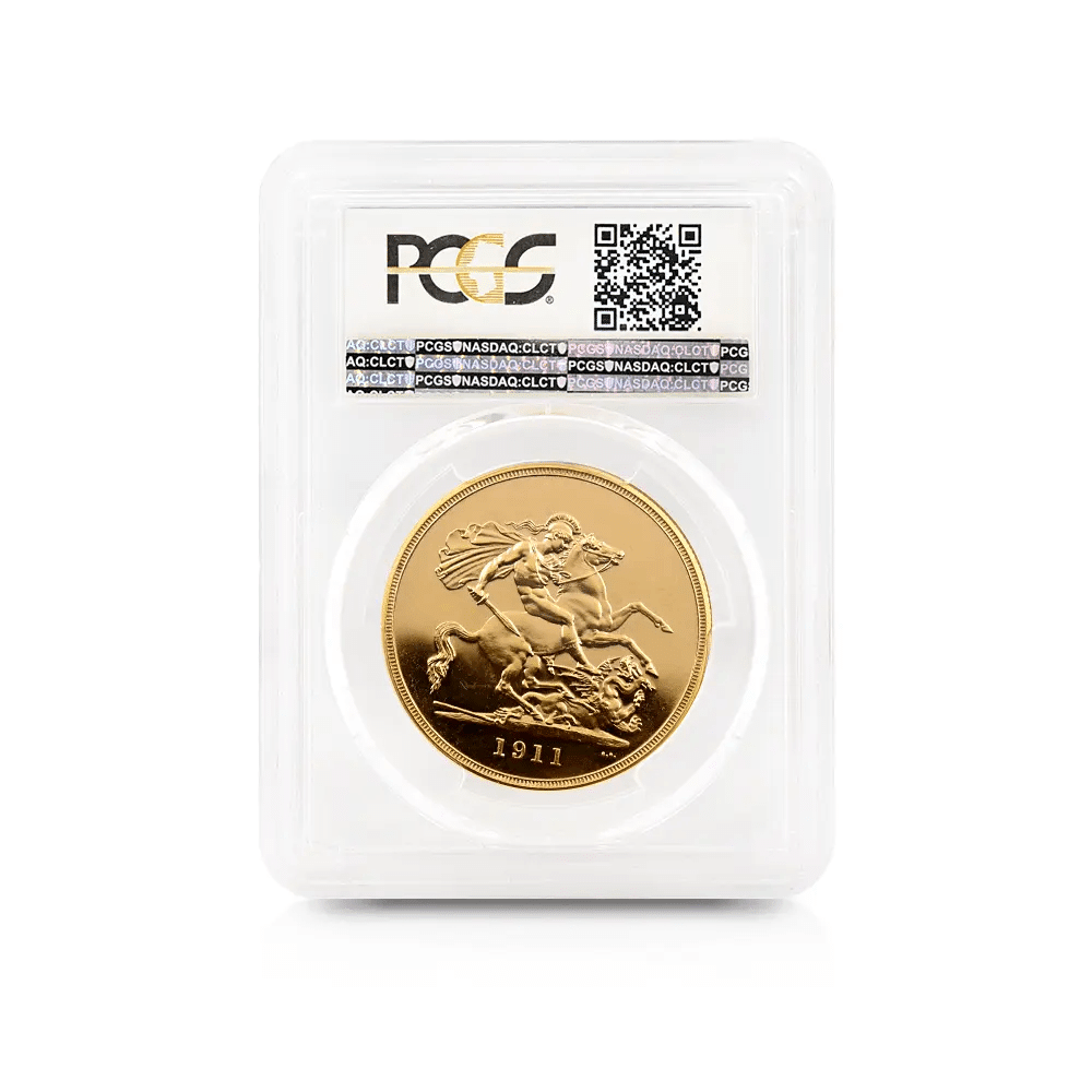 1911年、英国のジョージ5世が即位した記念に特別に発行されたこの5ポンド金貨は、当時から今日まで、高い芸術性と希少性で世界中のコイン収集家を魅了し続けています。