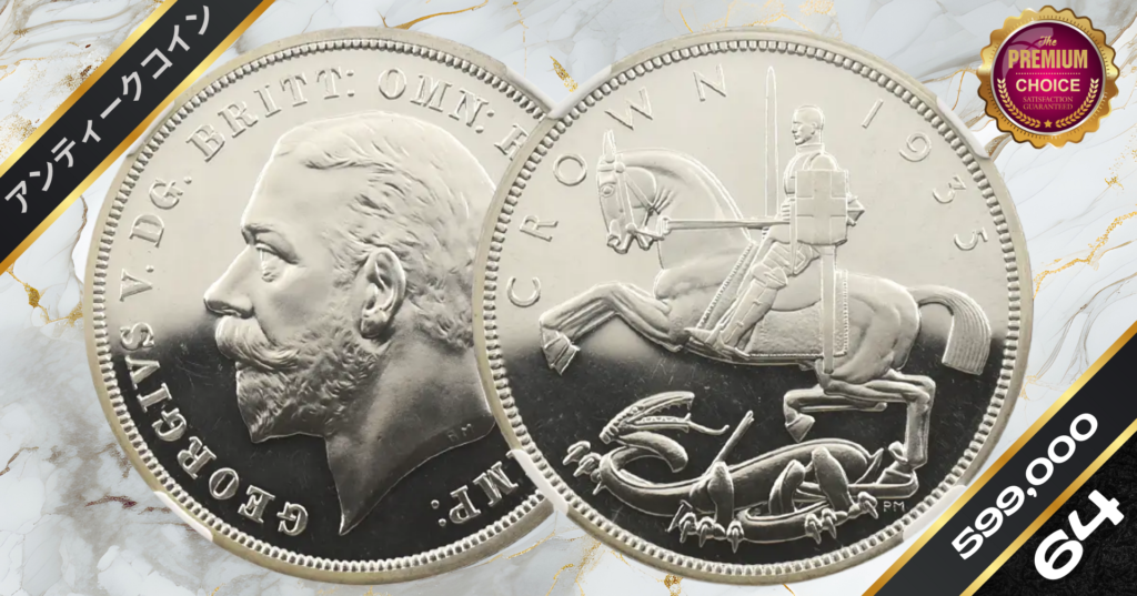 「1935年 ジョージ5世 シルバージュビリー クラウン銀貨」は、即位25周年を祝う特別な記念品であり、王の威厳と勝利を象徴するデザインを兼ね備えた逸品です。PF64CAという高い保存状態も、その価値を確固たるものにしています。