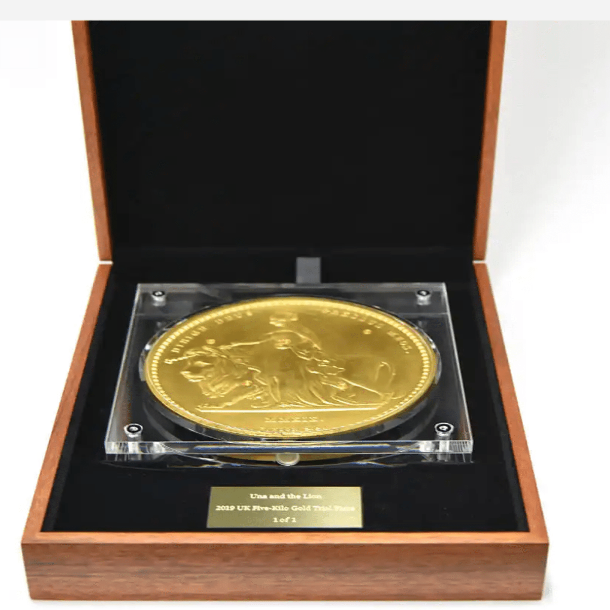 その重量は驚異の5キロ。これは英国王立造幣局が制作したコインの中でも史上最重量級の一枚です。この重量感と存在感を兼ね備えたコインは、もはや試作という域を超え、金貨の歴史に名を刻む逸品といえるでしょう。