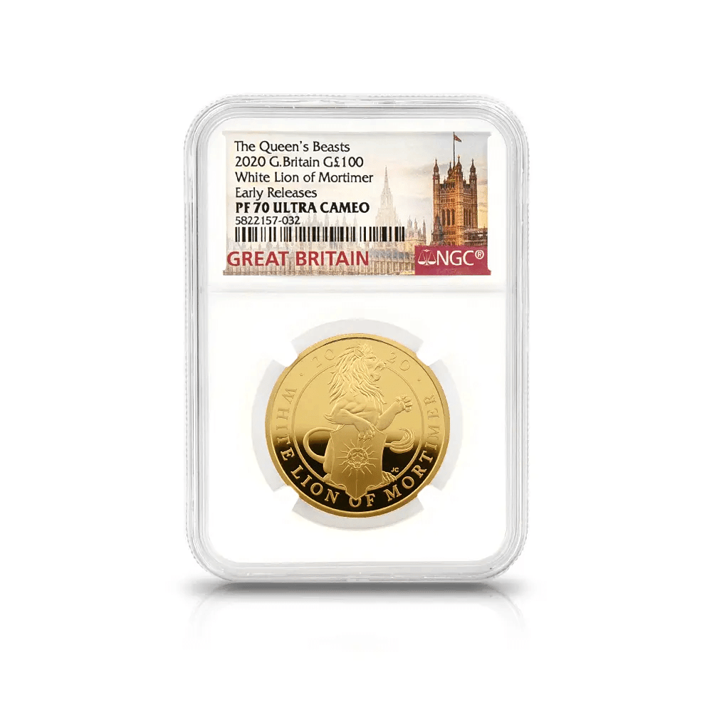 今回ご紹介する「2020年 エリザベス2世 クイーンズビースト モーティマーの白いライオン 100ポンド 1オンス金貨 アーリーリリース NGC PF70UC」は、その中でも特に“気高さと守護”を象徴する存在として高い人気を誇る逸品。