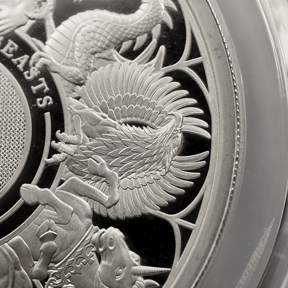 この評価を得た銀貨は、ごくわずかな厳選コインのみ。完璧を極めた鏡面仕上げは、守護獣たちの毛並み・鱗・翼のディテールを際立たせ、光を受けるたびに荘厳な輝きを放ちます。