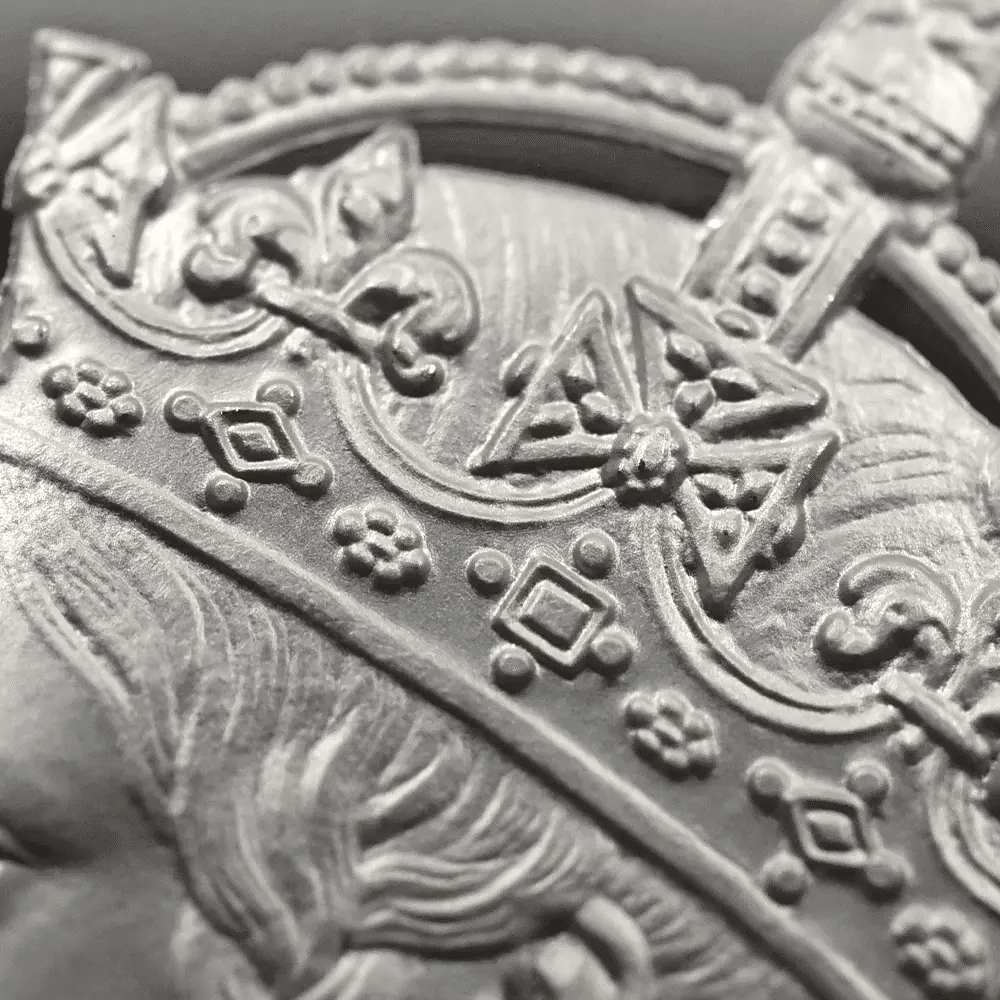 ワイオンの細密なゴチック様式を、英国王立造幣局の最新鋭技術が再現。その繊細なタッチと重厚な彫刻美は、もはやアートの域。
