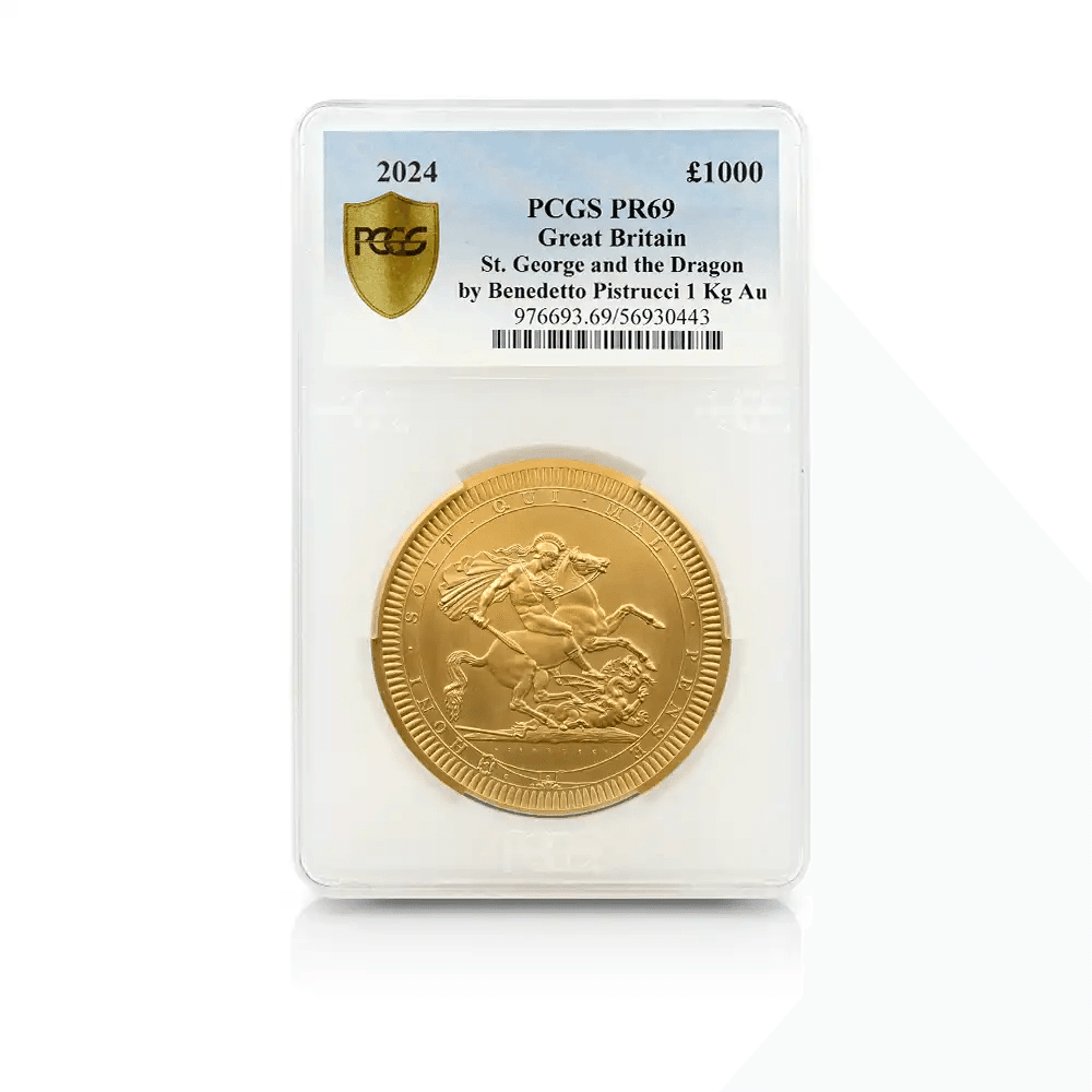 今回ご紹介するのは、「2024 チャールズ3世 ピストルッチ作 聖ジョージと竜退治 1000ポンド 1キロ金貨(PCGS PR69)」です。