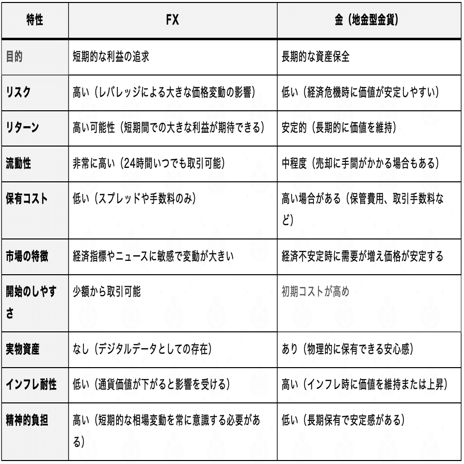 FXは短期的な利益を追求するのに適しており、大きな価格変動を利用して利益を狙います。一方、金(地金型金貨)は長期的な資産保全を目的とし、インフレ対策としての効果を発揮します。
