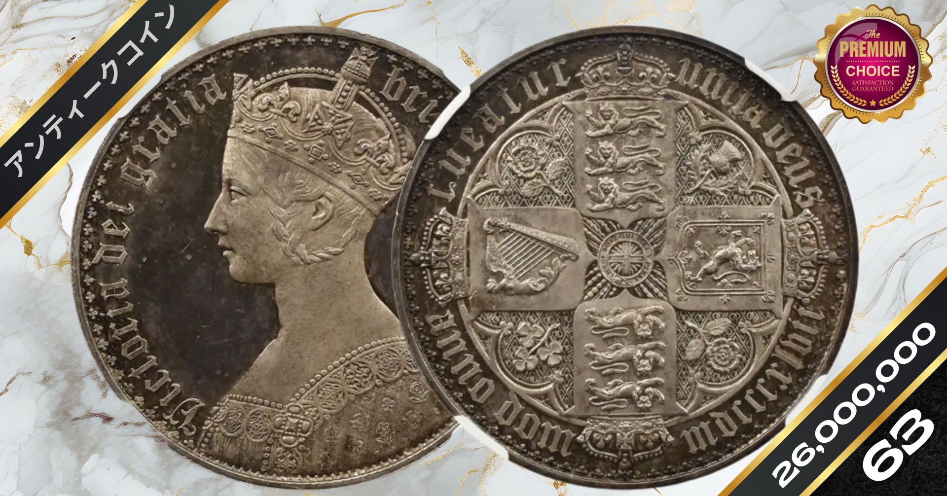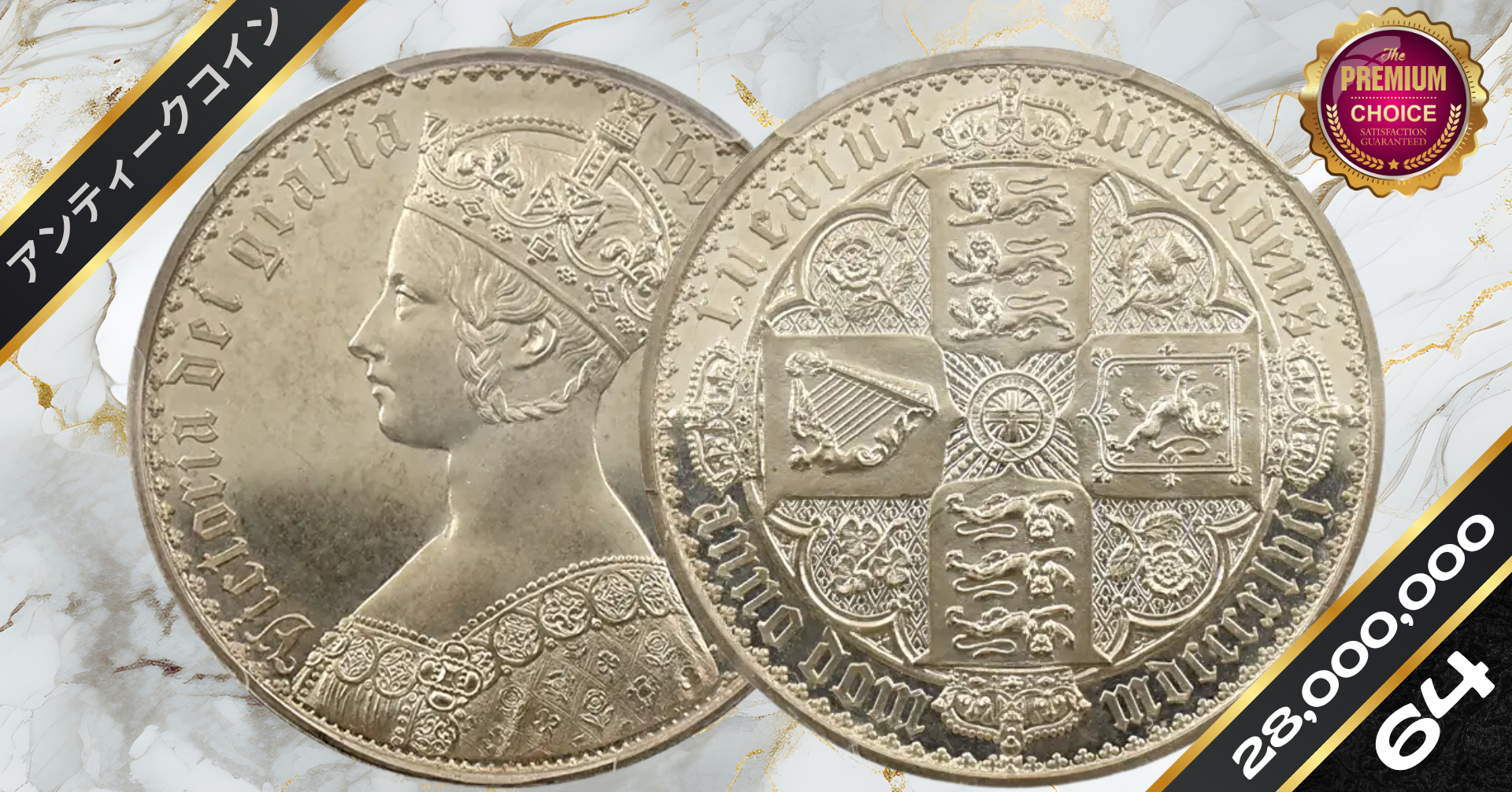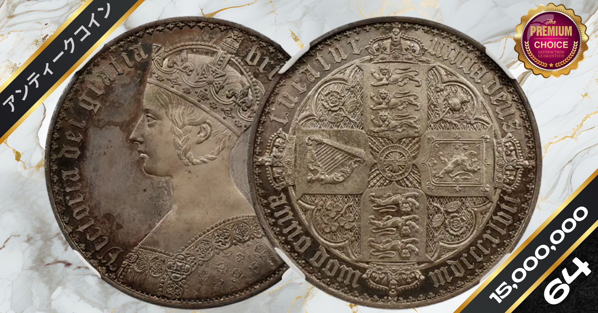1847 ヴィクトリア女王 ゴチッククラウン銀貨 アンデシモエッジ NGC PF64CAMEO
