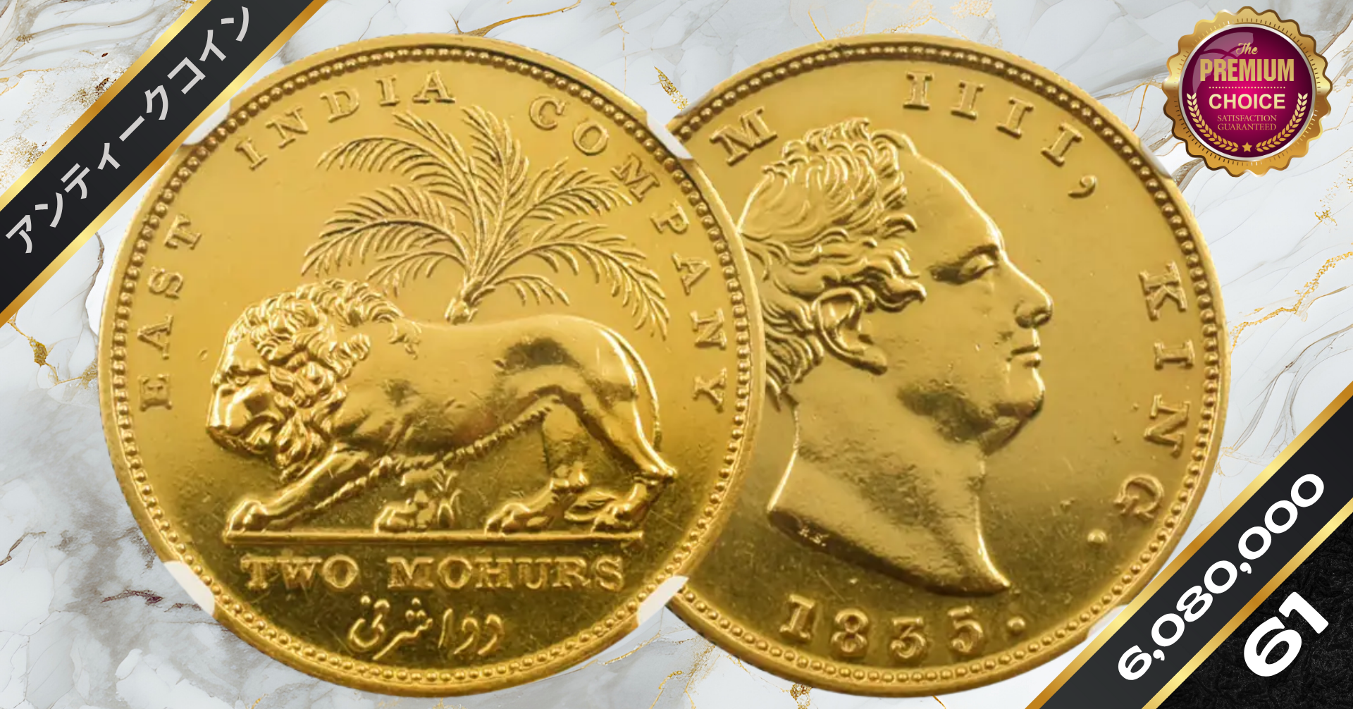 英領インド 1835C ウィリアム4世 2モハール金貨 リストライク NGC PF61 S&W-1.4